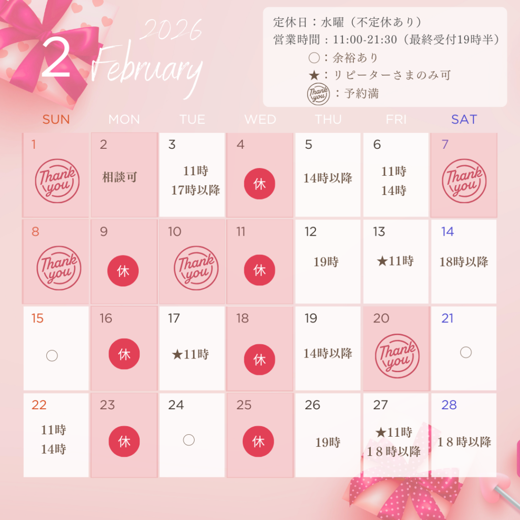※週1回程度の更新です。最新はLINE公式より実際の予約画面でお確かめください。